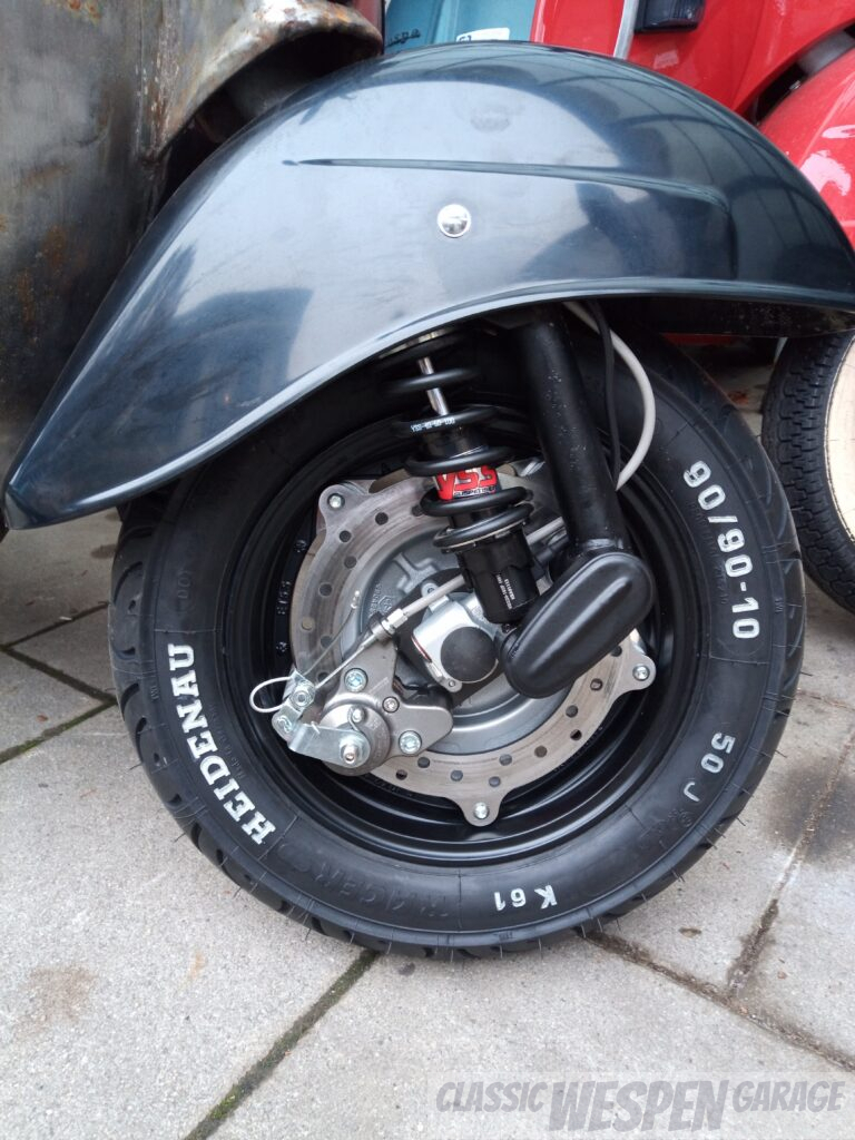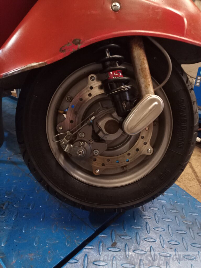 Deshalb war die erste Aufgaben oben den Dämpfer zu ändern, damit dieser direkt ohne Gabelbearbeitung passt. Dazu wurde von YSS eine Hülse gemacht, die etwas schlanker als der alte Dämpfer und so direkt in die Vespa V50 Gabel passt. Auch mit der Länge haben wir getüftelt, damit die Schwinge nicht zu steil steht und das Rad nicht „geländemaßig“ vom Look her im Kotflügel steht.