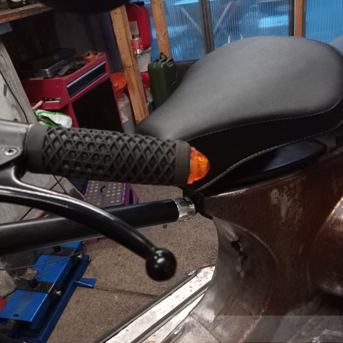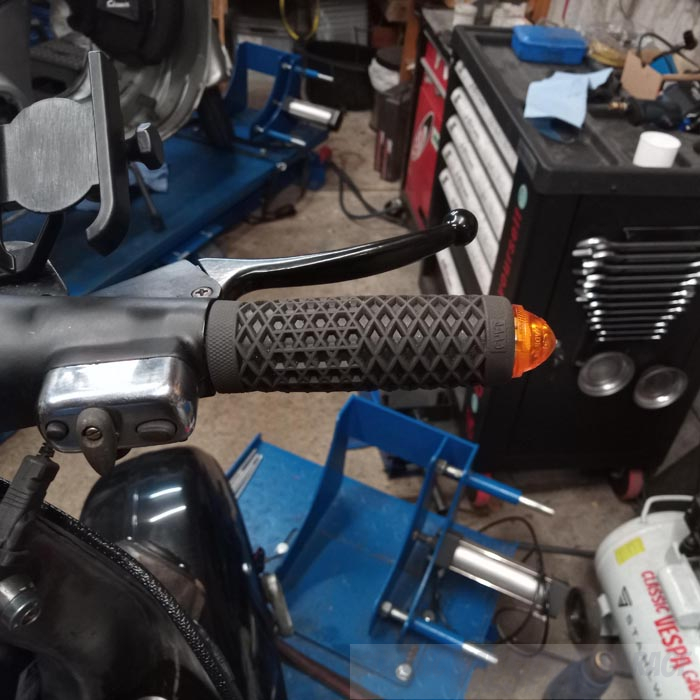 Man muss nur Standardgriff am Ende entsprechend aufscheinden und dann reicht es die Blinker nur zu „stecken“. Der Griff muss passend für das Klemmen der Blinker aufgeschnitten werden. Die originalen innenliegenden Blinkerrohre dürfen dann natürlich nicht drin sein.